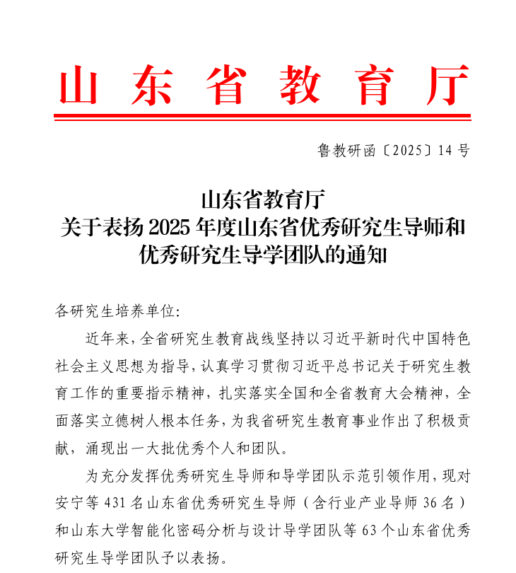 近日,山东省教育厅发布了《山东省教育厅关于表扬2025年度山东省优秀研究生导师和优秀研究生导学团队的通知》(鲁教研函〔2025〕14 号),王健教授获评“山东省优秀研究生导师”荣誉称号。